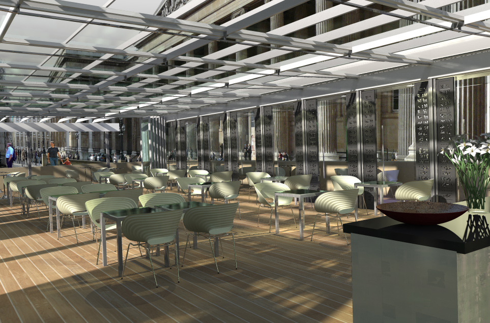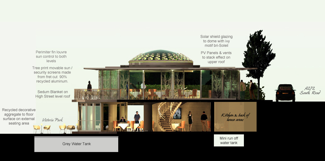The old hospital basement was to become an AIDS Awareness Centre. At the centre of the garden is a glass pyramid. A pyramid form was chosen as it is an ancient symbol of the transition from this world to the next. Being glass, this illuminates the foyer of the Awareness Centre which is under the garden. The pyramid is inscribed with lines from the AIDS Poetry Project, seeking the involvement of people who have a personal emotional history with this place. Their words are projected into the foyer and move with the light.